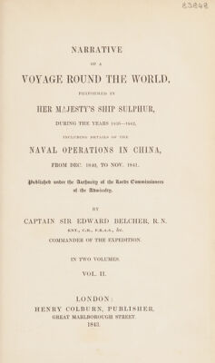 Narrative of a voyage round the world, performed in Her Majesty's Ship Sulphur, during the years 1836-1842. Including details of the naval operations in China, from Dec. 1840, to Nov. 1841 ; published under the authority of the lords commissioners of the Admiralty / by Captain Sir Edward Belcher, commander of the expedition.