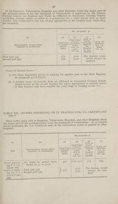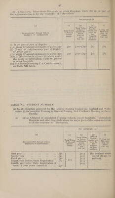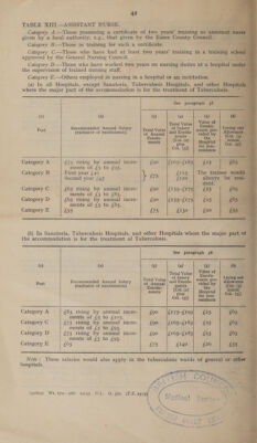 ![TABLE “Xiif. —ASSISTANT NURSE. Category A.—Those possessing a certificate of two years’ training as assistant nurse a given by a local authority, e.g., that given by the Essex County Council. _ Category B.—Those in training for such a certificate. approved by the General } Nursing Council. 4 Category D.—Those who have worked two years on nursing duties at a hospital under - | the supervision of trained nursing staff. ¥ Category E.—Others employed in nursing in a hospital or an institution. (a) In all Hospitals, except Sanatoria, Tuberculesis Hospitals, and other Hospitals q 7 where the major part of the accommodation is for the treatment of Tuberculosis. aan See paragraph 38 (1) (2) (3) (4) (5) ° (6) R ded Annual Sal Salary Ymole Living Oe Post ecommended, Anntal Salaty | Total Value] Of S207, | ments =| ae a ingle ments y [Col. (3) ments ere ney Hospital Col (ay : bes _ for non- ol. (5)] Col. Gi residents ¥ Category A £75 rising by annual incre- £90 (£165-£185| £25 FBS ments of £5 to £95. . Category B |. First year £40 ea £115 | The trainee would Second year £45 ae £75 £120 always be resi- |) dent. ‘g Category C £65 rising by annual incre- £90 \£155-£175| £25 £05 ments of £5 to £85. Category D £65 rising by annual incre- £90 \£155-£175| £25 £65 ments of £5 to £85. Category E | £55 £75 £130 £20 £55 (6) In Sanatoria, Tuberculosis Hospitals, and other Hospitals where the major PS ot the accommodation is for the treatment of Tuberculosis. See paragraph 38 (1) (2) (3) (4) (5) (6) Total Value| Value of : Total V of Salary ee ee Living out Post Recommended: Annual Salary | of “Annnal | M90 | “idea by | ments Cie Hospital Col ol ay} Col. (3)] | residents Category A £85 rising by annual incre- £90 |£175-£1905| £25 £65 ments of £5 to £105. Category C £75 rising by annual incre- £90 |£165-£185| £25 £05 ments of £5 to £95. Category D £75 rising by annual incre- £90 £105-£185 £25 £65 ments of £5 to £95. 2 j Category E £65 £75 £140 £20 £55 Note: These salaries would also apply in the tuberculosis wards of general or other ‘ hospitals. Ft](https://iiif.wellcomecollection.org/image/b32178529_0042.jp2/full/800%2C/0/default.jpg)
