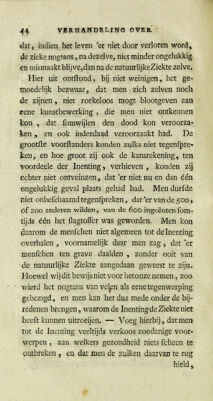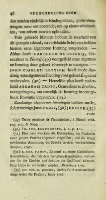 ![dan zouden eindelijk de Kinderpokken, geene voor. werpen meer ontmoetende, om op nieuw te bermet- ten, van zelven moeten ophouden. Vele geleerde Mannen hebben de waarheid van dit gezegde erkend, en verfcheide Schrijvers hebben hierom eene algemeene Inenting aangeraden. •— Aldus heeft gandoger de foignij. Ge- neesheer te Nancij (49_) voorgefteld eene algemee- ne Inenting door geheel Frankrijk te verrigten — JOHN COAKLEIJ LETTsoM heeft mede dus- danig eene algemeene Inenting voor geheel Engeland aanbevolen. C50) — Hetzelfde plan heeft nader- hand ABRAHAM ZADiG, Geneesheer te Breslau, voorgedragen, om namelijk de Inenting in eene ge- heele Provintie intevoeren. C51J Zoodanige algemeene Inentingen hebben mede, federt weinige Jaren F A u s T, (52) j u w cii E R ,(53) F IN- (49) Traite pratique de i'inoculation, h. Nancij 1768. pag. 403. & Seqq. Qo) Fr. aug. boüchholtz, I. c. p. 102. (51) Plan nïch welchem die Eimimpfung der Pockenin ciner ganzen Provinz allgemein eingeführt, und die langst gewünschte Ausrottung der Seuche erreicht werden könte. Breslau, 1797. (52) B. ciiR. FAUST, Entwurf zu einem Gefundhcits- Katechismus, der mit dem Religions-Katechismus verbun- den für die Kirchen und Schulen der GraflTctiaft Schaum- burg-Lippe ist entworfen worden, Buckeburg x-j^i. C53) ]o CHR. w. jüNCKER, Archivfür AerzteundSeel' tbrge wider die Pocken, Halle 179Ö.](https://iiif.wellcomecollection.org/image/b21005758_0060.jp2/full/800%2C/0/default.jpg)