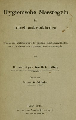Hygienische Massregeln bei Infectionskrankheiten. Ursache und Verbreitungsart der einzelnen infectionskrankheiten, sowie die daraus sich ergebenden Vorsichtsmassregeln. Von Geo. H. F. Nuttall. deutsch von O. Cahnheim.