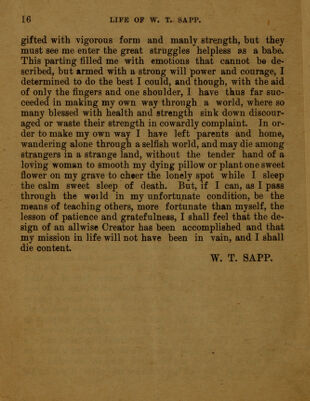 Life of W.T. Sapp, the world famous ossified man / written by himself ; a brief account of his life, condition and experience ; a book from which every man, woman and child in the land may learn a lesson of patience, cheerfulness and self reliance.