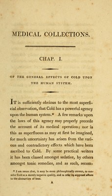 Medical collections on the effects of cold, as a remedy in certain diseases : with an appendix, containing an account of some experiments made with a view to ascertain the effects of cold water upon the pulse / by John Edmonds Stock, M.D.