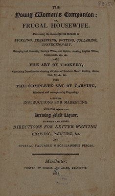The young woman's companion: or, frugal housewife. Containing the most approved methods of pickling, preserving, potting ... ; also the art of cookery ... instructions for marketing ... to which are added directions for letter writing, drawing, painting, &c.