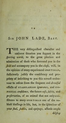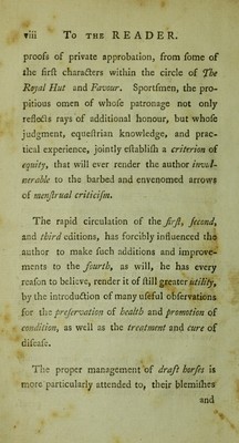 The gentleman's stable directory; or, modern system of farriery. : comprehending the present entire improved mode of practice: likewise all the most valuable prescriptions and approved remedies ... interspersed with occasional remarks upon the dangerous and almost obsolete practice of Gibson, Bracken, Bartlet, Osmer, and others. Also directions for feeding, bleeding, purging, and getting into condition for the chase. To which are now added, useful instructions for buying and selling; with an appendix, containing experimental observations upon the management of draft horses, their blemishes and defects. Inscribed to Sir John Lade, Bart. / by William Taplin.