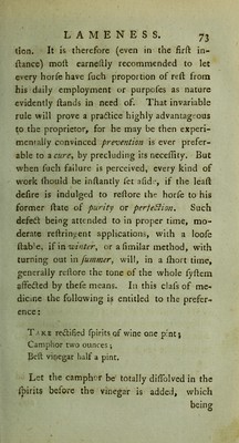 Credit: The gentleman's stable directory; or, modern system of farriery. : comprehending the present entire improved mode of practice: likewise all the most valuable prescriptions and approved remedies ... interspersed with occasional remarks upon the dangerous and almost obsolete practice of Gibson, Bracken, Bartlet, Osmer, and others. Also directions for feeding, bleeding, purging, and getting into condition for the chase. To which are now added, useful instructions for buying and selling; with an appendix, containing experimental observations upon the management of draft horses, their blemishes and defects. Inscribed to Sir John Lade, Bart. / by William Taplin. Source: Wellcome Collection.