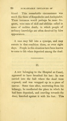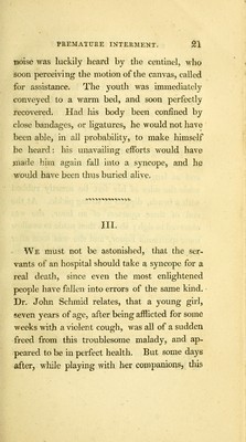 The danger of premature interment : proved from many remarkable instances of people who have recovered after being laid out for dead, and of others entombed alive, for want of being properly examined prior to interment. Also a description of the manner the ancient Egyptians, and other nations preserved and venerated their dead, and a curious account of their sepulchral ever burning lamps and mausoleums. Likewise the pernicious effects of burying in the body of churches, and confined church yards pointed out, whereby many valuable lives have been lost to the public, and their friends. Selected from historical records / by Joseph Taylor.