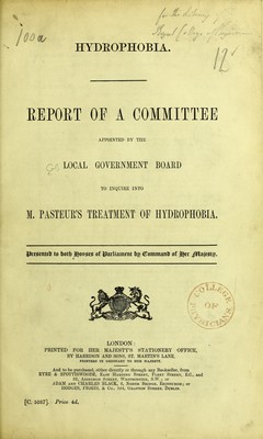 ![HYDROPHOBIA. i^/ EEPOET OP A COMMITTEE APPOINTED BY THE Q(t LOCAL GOVERNMENT BOARD TO INQUIRE INTO M. PASTEUR'S TREATMENT OF HYDROPHOBIA. ilrmntetr to tjott ^ousie^ of Parliament 5g ©ommanU of ^tx JWiaMs* LONDON: PRINTED FOR HER MAJESTY'S STATIONERY OFFICE, BY HAERISON AND SONS, ST. MARTIN'S LANE, PBINTEKS IN ORDINART TO HER MAJESTT. And to be purchased, either directly or through any Bookseller, from EYRE & SPOTTISWOODE, East Harding Street, Fleet Street, E.G., and 32, AiUNGDON Street, Westminster, S.W. ; or ADAM AND CHARLES BLACK, 6, North Bridge, Edinburgh; or HODGES, FIGGIS, & Co., 104, Grafton Street, Dublin. [C. 5087]. Price 4d](https://iiif.wellcomecollection.org/image/b23984806_0003.jp2/full/800%2C/0/default.jpg)