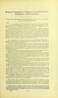 Report of a Committee appointed by the local Government Board to inquire into M. Pasteur's treatment of hydrophobia / presented to both Houses of Parliament by Command of Her Majesty.