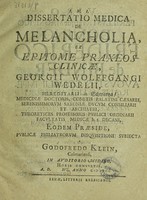 Dissertatio medica de melacholia / ex epitome praxeos clinicae, Georgii Wolffgangi Wedelii ... eodem praeside. Public Domain Mark. Source: Wellcome Collection.