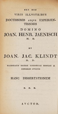 Dissertatio inauguralis medica de spiritus vini usu et abusu ... / pro gradu doctoris medicinae et chirurgiae rite obtinendo eruditorum examini submittit auctor Nicolaus Jaenisch ... Die I. Octobr. MDCCLXXXXIII.
