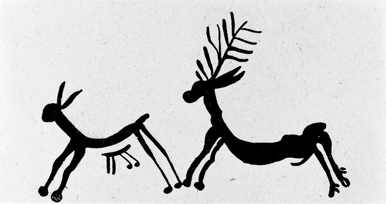 M0015073: Neolithic representation of hind, young fawn and stag, Spain. In copyright. Source: Wellcome Collection.