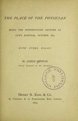 The place of the physician : being the introductory lecture at Guy's hospital, October 1873, with other essays / by James Hinton.