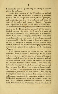 Cholera and its homoeopathic treatment : with an account of its success in Europe, and America, and remarks upon its symptoms, preventive means, early management, &c, &c. / by Daniel Holt.