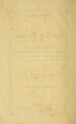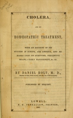 Cholera and its homoeopathic treatment : with an account of its success in Europe, and America, and remarks upon its symptoms, preventive means, early management, &c, &c. / by Daniel Holt.