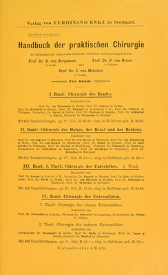 ![Karewski, Dr. F., Die chirurgischen Krank- heiten des Kindesalters. gr. 8°. 1894. geh. M. 20. Mit 825 in den Text ge- gedruckten Abbildungen. Kaufmann, Handbuch der Unfallver- 1 pt71TS10'PTI Berücksichtigung der deutschen, österreiclii- XC \j£i lü->g C/Al« sc]ien und schweizerischen Rechtsprechung in Un- fallversichernngs- und Haftpflichtsachen. Für Aerzte, Versicherungs- beamte und Juristen. Zweite neubearbeitete und vermehrte Auflage. gr. 8°. 1897. geh. M. 10.— Kirmisson, d!.toe,, Lehrbuch d. chirurgischen Krankheiten angeborenen Ursprungs. Autorisirte Uebersetzung von Dr. Carl Deutschländer. Mit 312 Ab- bildungen. gr. 8°. 1899. geh. M. 15.— Lossen, Prof. Dr. Herrn., Grundriss der Fracturen und Luxationen. und Aerzte. Mit 70 Abbildungen. 8°. 1897. geh. M. G.—; in Leinwand geb. M. 7.— Seydel, Lehrbuch der Kriegs- chirurgie. Mit 176 Abbildungen, gr. 8°. 1893. geh. M. 8.— Stratz,DcmHeb- Die Schönheit des weiblichen Körpers. Den Müttern, Aerzten und Künstlern gewidmet. Mit 180 teils farbigen Abbildungen im Text, 5 Tafeln in Heliogravüre und 1 Farbentafel. Zehnte Auflage, gr. 8°. 1901. geh. M. 12.—, in Leinw. geb. M. 13.40. Thiem, San.-Rath Dr. C., Handbuch der TTn fa 11 pvlrra n Irn ri trpn ^rund etlicher itrfah- U III dilKRüg dl. rungen< Mit los Figuren im Text. gr. 8°. 1898. geh. M. 24.— v. Winiwarter, Prof. Dr. A., Lehrbuch der chirurgischen Operationen und Ver- TlänflA Älit 60 in den Text Kedruckten Holzschnitten, gr. 8°. pamie. 1894> geh> M# 12._ Druck der Union Deutsche Verlagsgesellschaft in Stuttgart.](https://iiif.wellcomecollection.org/image/b28070264_0150.jp2/full/800%2C/0/default.jpg)