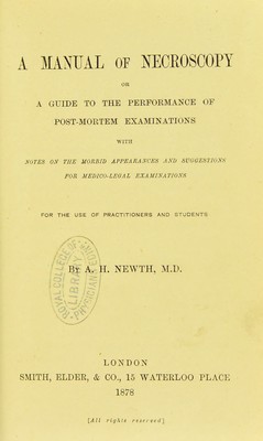 A manual of necroscopy, or, A guide to the performance of post mortem examinations, with notes on the morbid appearances, and suggestions for medico legal examinations : for the use of practitioners and students / by A.H. Newth.