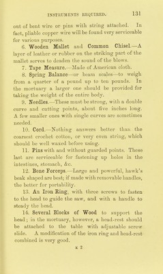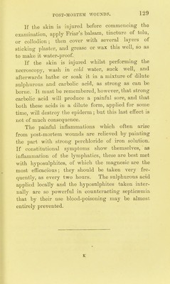 ![State of the N'atural Orifices.—Eyes, ears, nostrils, mouth (44), anus (61), urethra (86). Look for foreign bodies, signs of wounds, &c., in these. State of the liimbs.—Position; rigor mortis. Size of hands and feet; delicately or coarsely formed, showing signs of handicraft (7). Special marks. Condition of the nails; contents (blood, dirt, grass, &c.) (7). Features.—Kelaxed or contracted; eyelids closed or open; condition of cornea and pupils (10). Mouth (44); contents, position of tongue, state of the teeth. OarefuUy examine the Spine for dislocations, fractures, punctures, &c. (118). Internal Examin-ation. Thorax uncovered (not opened), abdomen opened (13). Amount of fat or its absence on chest and abdomen. Wounds. State and position of the undisturbed abdominal contents (50), peritoneum, mesentery, &c. Foreign bodies; disease (51). Position of the diaphragm. Thorax Opened (13, 32).—Position of thoracic organs. Pericardium (16); mediastinum; pleura {undisturbed). Heart (18).—Shape, appearance, weight. State of coronary vessels. Bulging of am-icles and ventricles ; fat. Cavities.—Clots ; muscular structure ; valves. Vessels.—Aorta, pulmonary artery, vena cava, &c. (26). ]Larynx, Trachea, Bronchi, &,c. (33).—Abnormali- ties, foreign bodies, disease, &c. Iiungs (35, 36).—Pleura—adhesions, conteiits. Right and left limgs—colour, consistence, appearance, weight, &c. Abdomen. Iiiver.—Eorm, weight, consistence (62). Gall blad- der (68). Pancreas. Spleen (69). Kidneys (73).—Right and left; appearance of cortical](https://iiif.wellcomecollection.org/image/b21932748_0150.jp2/full/800%2C/0/default.jpg)