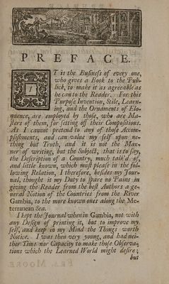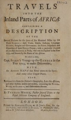 Travels into the inland parts of Africa containing a description of the several nations for the space of six hundred miles up the River Gambia; their trade, habits, customs, language, manners, religion and government; the power, disposition and characters of some negro princes; with a particular account of Job Ben Solomon. To which is added, Capt. Stibbs's voyage up the Gambia in the year 1723, to make discoveries; with an accurate map of that river taken on the spot: and many other copper plates. Also extracts from the Nubian's Geography, Leo the African and other authors antient and modern, concerning the Niger-Nile, or Gambia. And observations thereon / By Francis Moore.
