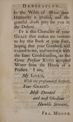 Credit: Travels into the inland parts of Africa containing a description of the several nations for the space of six hundred miles up the River Gambia; their trade, habits, customs, language, manners, religion and government; the power, disposition and characters of some negro princes; with a particular account of Job Ben Solomon. To which is added, Capt. Stibbs's voyage up the Gambia in the year 1723, to make discoveries; with an accurate map of that river taken on the spot: and many other copper plates. Also extracts from the Nubian's Geography, Leo the African and other authors antient and modern, concerning the Niger-Nile, or Gambia. And observations thereon / By Francis Moore. Source: Wellcome Collection.