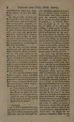 ![; Dublin’ Fournal, Ful 3, 1744, remarks on an advertifement, and on certain affidavits, concern- ing the effects of Tarwater in Sre- pens’ hofpital, and having promif- ed to communicate to the public an account of feveral perfons, who have been entirely cured or greatly relieved by the ufe of T'arwater on- ly, together with. their names, places of abode, and nature of their silments; I now addrefs myfelf to the performance of my promife. _ 2. Many very freely communi- cated their ailments and reliefs; -fome who had received benefit on the firk drinking of it, chofe to poftpone fending their accounts, till they had received the fall be- nefitthey expe€ted. Some, efpe- cially of the female fex, were un- willing to have their nafnes men- tioned in public. Some cafes re- quired ‘a long trial, before any judgment could be formed, or a cure effected. It was alfo fegpetted by thofe who decried its ule, that Whatever feeming benefit fome tmight have rectived on their firft drinking, yet that towards the fal] of the leaf, orthe winter follow- ing, they would feel fatal confe- quences from it, infinuating that it was dangerous to drink it in the dog-days, or in cold weather, by which means feveral were prevail- ed upon tolay afide the drinking of it for fome months ; but finding no fuch confequences, they have fince refumed the Grinking of it with great advantage. 3. For thefe and many other of the. Effects of AyD. ER, reafons the publication cf thefe cafes has been fo long deferred; but many thoufands have now drank Tarwater, and great num-~ bers received benefiz. Since time, experience, and many trials (the fureit guides in cafes of this nature} have eftablifhed the credit and ufe of this medicine, it would be a prejudice to the public, and am injury to mankind,’to defer any longer the publication of the many unexpected and furprizing cures ef- fected by Tarwater. And as par- ticular inflances and faéts make ftronger impreflions than general af- dertions and reajonings can do, it is with great fatistaétion I can inform the public, thatlam fur- nifhed with a greatnumber of au- thentic accounts of the effeéts of ‘Tarwater (more perhaps than ever happened in the cafe of any ‘other medicine info fhort a time) and that chiefly from the patients themfelves, moft of them men of character and integrity, who, be- fides the pleafure of recounting the benefits they received, had no other view in communicating their. others, who might labour under the fame diforders. Aba 4. With the fame view, I can affure the public, that I have mof& impartially laid before them the facts communicated to me, in the letters of the gentlemen who have been fo good as to give a detail of theirown diforders, or of thofe of their neighbours, and of the bene- fit they received ; the originals of which may be vicwed in my hands. ees 3, From](https://iiif.wellcomecollection.org/image/b32886159_0007.jp2/full/800%2C/0/default.jpg)