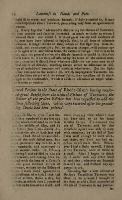 ![* BP. clog okt Dany Ole Our Gens. ; ‘¥, . . Bi ith i } 10S ae DP est Containing the moft material extradis from two trads written by thofe learned Philofopbers, Dr. Srepuzn Hauss, fellow of the Royal Society, and A, Reip,. E/q; printed at Lon- sr Recto a ser es Roabers aro oes ter 7 SHE firft tract is intithed—“*4n account of fome Experiments and Ob- ¥ “Jervations on Tarwater ; avhertin is foewn the quantity of Tar that is therein: which was read before the Royal Society. Therein thé Dr. fays, ‘* That having made Taravater in proportion of a gallon of water to 4 quart of Sar, ftitring it 4. minutes, and evaporating a pint of faid Tarwater in a Florence-flafk 3 of that_ made with Norway or Savedi/f> Tar, which Was 30 years old, and very thick and ff, there remained at the bottom of the flatk 44 grains of thick, dark, reddifh Tar. of a bitterifh burnt talte; —— “ with common, coarle, ftitf American Tar, 28 grains =~ —— © with fF Var jutt brought from Noravay, 61 grains — © with the o/d Var ftirred balf an hour, 93 grains — —— * with the ¢hinner ‘Lar ftirred 8 minutes, 26 grains = | ‘with 4 feveral parcels of Noraay or Swedifo Tat, not fp Sif, but more foft and oily than the Tar above, and efteemed by the dealers in Tar to be very good (for ropes) only between 5 and 15 grains. [But the Dr. does not fay, how long time elapfed between his firring of the Tar with the water, and his evaporating it: nor docs he afcertain whether thefe Tars were of the jir/?, middle or Jatter runnings from the ‘kiln; in which there is a vaft difference, as the longer it burns, the more pitchy the Tar grows. ] ‘“That.in a pamphletin an/wer to the Bifhop of Cloyne, he finds that on diftilling 22 pounds of belt Norway Tar, there were of | | il tei i ats PO Pom wih * Pounds. Ounces. : Pitch 2 es © ‘12 14. OMe ae 9 13 Acid Spirit - -1 | 25 3 hares * Wings Lot - --- © 25 ” 22 ‘ That the earer made with o/d, fliff, le/s un€uous Tar, feems to tafe fenfibly ftronger of the acid fpirit, than that made with thinner, more une juous Tar: on which account the fiffer would be preferable, were ig not that it communicates too much of its grofér parts alfo to the water, and that the water made with the thinner Tar taites much flronger of /oot or /moke than that made with the tiff Tars. BS, @ ‘© That in filtrating thefe feveral Tarwaters through filtring paper, no Tar nor oily iubitance remained in the paper; not even of that Tarwa- ter which had 93 grains of Tar in a pint: nor were the filtring it](https://iiif.wellcomecollection.org/image/b32886159_0078.jp2/full/800%2C/0/default.jpg)