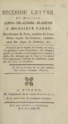 Seconde lettre de monsieur Janin-de-Combe-Blanche, à monsieur Cadet, apothicaire de Paris, membre de l'Académie royale des sciences, commissaire des objets de salubrité, &c / [Jean Janin].