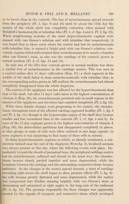 ![[Reprinted from the Journal of Physiology, 1952, Vol. 116, No. 3, p. 320.] PRINTED IN GREAT BRITAIN J. Physiol. (1952) 116, 320-349 THE EFFECT OF HYPERVITAMINOSIS A ON EMBRYONIC LIMB-BONES CULTIVATED IN VITRO By HONOR B. FELL (Foulerton Research Fellow, Royal Society) AND E. MELLANBY, F.R.S. From the Strangeways Research Laboratory, University of Cambridge, and the Nutrition Building, National Institute for Medical Research, London, N.W. 7 (Received 10 October 1951) Experiments on young animals have shown (Mellanby, 1938, 1939, 1944, 1947) that vitamin A determines the shape and texture of certain bones by controlling the position of the osteoblasts and osteoclasts of periosteal bone and the intensity of their activity. Both deficiency and excess of the vitamin cause severe changes in the skeleton, though the way in which the vitamin acts remains obscure. Some years ago a method was developed for cultivating early bone rudi¬ ments in vitro (Fell & Robison, 1929; Fell, 1951); the explants grew and con¬ tinued to differentiate in vitro in a surprisingly normal way. It occurred to Mellanby (1944) that such bone cultures might be used to study the action of vitamin A on skeletal tissue and especially to decide whether the action was a direct one. The method of cultivating organized tissues in vitro may be a valuable adjunct to animal experiments because of the great simplification of experimental conditions which it provides. In vitro there are no vascular or nervous systems, and the influence of other organs is completely eliminated; thus any effect produced by a chemical agent in vitro must be due to its direct action on the tissue. Also the experimental conditions can be widely varied at will and are more easily controlled in a tissue culture than in the body; the technique has the further advantage that the living explants can be observed under the microscope whenever desired. It was therefore decided to undertake experiments on the effects of hypervitaminosis A on embryonic long bones cultivated in vitro by the watch-glass method. In the living animal, hypervitaminosis A renders the long bones fragile, so that they sometimes suffer spontaneous fracture. This has often been observed in young rats fed on a diet containing an excessive quantity of vitamin A](https://iiif.wellcomecollection.org/image/b3063359x_0001.jp2/full/800%2C/0/default.jpg)
