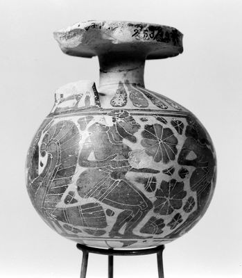 Credit: M0018101: Round aryballos, late Corinthian, showing 6 padded dancers and a siren. Source: Wellcome Collection.