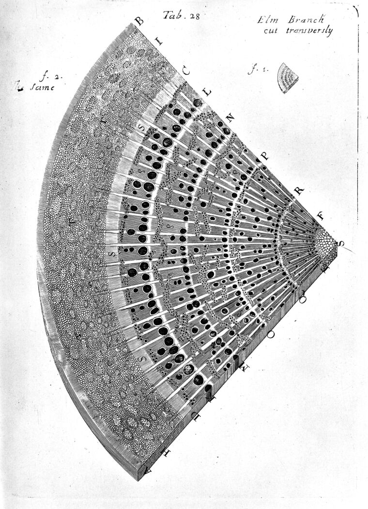 M0012716: Illustration of a cross section of Elm wood. Public Domain Mark. Source: Wellcome Collection.