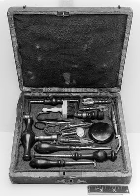 Credit: M0016452: Case of trephination instruments, mid 18th century. Source: Wellcome Collection.