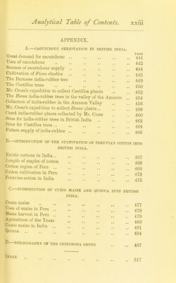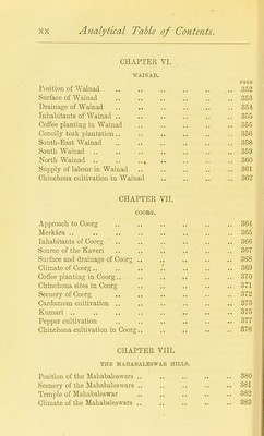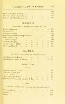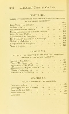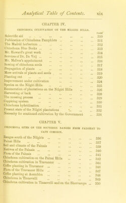 ![CHAPTER IV. CHINCHONA CULTIVATION ON THE NILGIBI HILLS. Scientific aid .. .. .. ,. 310 Publication of Chinchona Pamphlets .. .. ,. ,.311 The Madrid herbarium .. .. .. .. ., .. 312 Chinchona Blue Books .. .. .. .. .. 313 Mr. Howard's great work .. .. .. „ ,. 314 Services of Dr. De Vrij .. ,. ., .. .. .. 315 Mr. Mclvor's appointment .. .. .. .. ., 316 Sowing of chinchona seeds .. .. .. .. .. 317 Propagation of plants .. .. .. .. ., .. 318 More arrivals of plants and seeds .. .. .. .. 319 Planting out .. .. .. .. .. .. _ _ 320 Improvement under cultivation .. .. .. 324 Species on the Nilgiri Hills .. .. .. .. .. 325 Enumeration of plantations on the Nilgiri Hills ,. .. 326 Harvesting of bark .. .. .. 328 The mossing process .. .. .. 329 Coppicing system 33O Chinchona hybridisation .. .. ., 33I Present state of the Nilgiri plantations •. 332 Necessity for continued cultivation by the Government .. 334 CHAPTER V. CHINCHONA SITES ON THE SOUTHERN RANGES FEOM PALGHAT TO CAPE COMOKIN. Ranges south of the Nilgiris ,. .. 336 Palnai Hills .. .. 337 Soil and climate of the Palnais .. .. .. .. 339 Natives of the Palnais _ 34O Flora of the Pakais .. .. _ 34]^ Chinchona cultivation on the Palnai Hills .. .. .. 342 Chinchona cultivation in Travancor .. ., .. 344 Coffee planting in Travancor , _ 346 Flora of the Travancor Hills .'.'347 Coffee planting at Asambhu .. .. .. 348 Chinchona in Tinnevelli .. .. _^ 349 Chinchona cultivation in Tinnevelli and on the Shervaroys .. 350](https://iiif.wellcomecollection.org/image/b21297344_0025.jp2/full/800%2C/0/default.jpg)