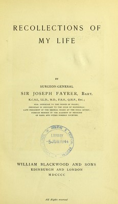 Recollections of my life / Surgeon-General Sir Joseph Fayrer, Bart.
