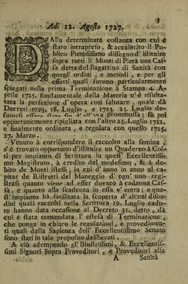 Seconda terminazione regolativa in materia delle Casse del bagatino di sanita istituite sopra tutti li Monta di pieta cosi delle Citta principali, come di luochi alle medesime, o per naturale, o per delegata facolta subordinata. Emanata dagl' Illustriss[imi] ... signori Sopra Proveditori e Proveditori alla sanita. In relazione al supremo decreto dell' eccellentissimo Senato 31. Luglio 1727.
