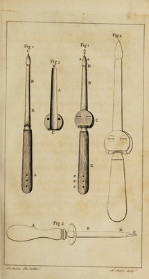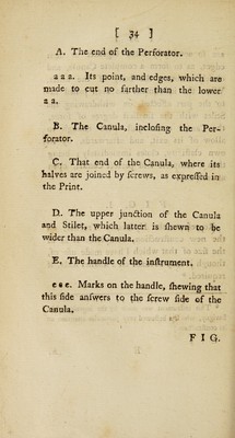 ![/ C 34 ] A. The end of the Perforator. a a a. Its point, and edges, which are made to cut no farther than the lower a a, f: ,e % B. The Canula, inclofing the Per¬ forator. * - ' ’ '« 9 ■ • * •* i •>/ ) \ , ; . ■ ■ i •••:• < . -- U u C? That end of the Canula. where its halves are joined by ferews, as exprelTed in the Prints D. . The upper jundtion of the Canula and Stilef, which latter is ihewn to be wider than the Canula. . v ,.• ... f ■ * f - *r. . -4 .> - ■,? _ i ' : - ? '< s » •> i. v ‘ E, The handle of the inftrurncnt. e « e. Marks on the handle, Shewing that this fide anfwers to the fcrew fide of the Canula. . ?■'.< - l , • • ■■ ; yj F I G. < ».v»](https://iiif.wellcomecollection.org/image/b30792472_0036.jp2/full/800%2C/0/default.jpg)