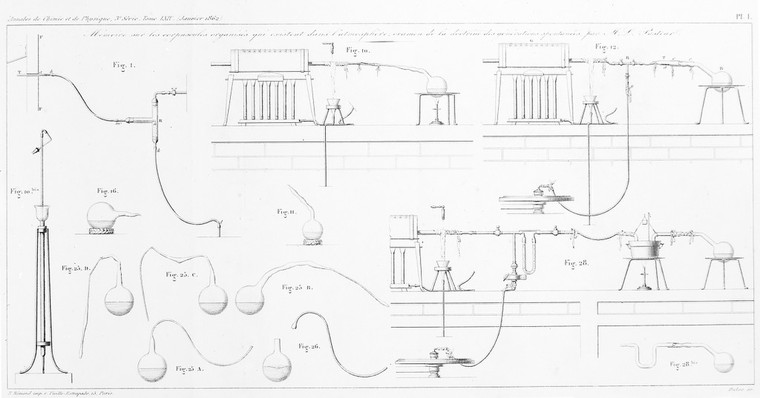 M0013300: Drawing of the apparatus used by Pasteur in experiments. Public Domain Mark. Source: Wellcome Collection.