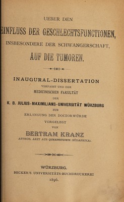 Ueber den Einfluss der Geschlechtsfunctionen, insbesondere der Schwangerschaft, auf die Tumoren ... / vorgelegt von Bertram Kranz.