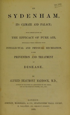 On Sydenham, its climate and palace : with observations on the efficacy of pure air, esoecially when combined with intellectual and physical recreation, in the prevention and treatment of disease / by Alfred Beaumont Maddock.