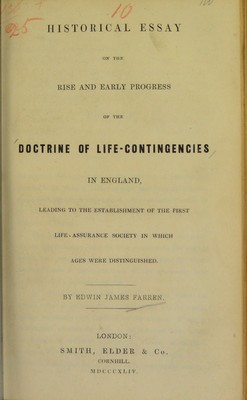 Historical essay on the rise and early progress of the doctrine of life-contingencies in England : leading to the establishment of the first life-assurance society in which ages were distinguished / by Edwin James Farren.