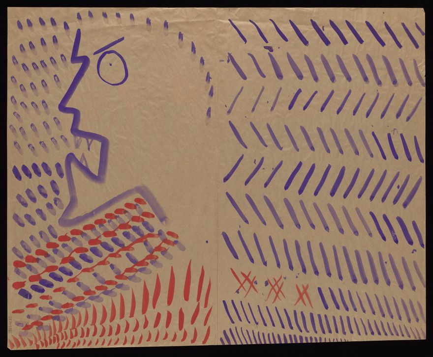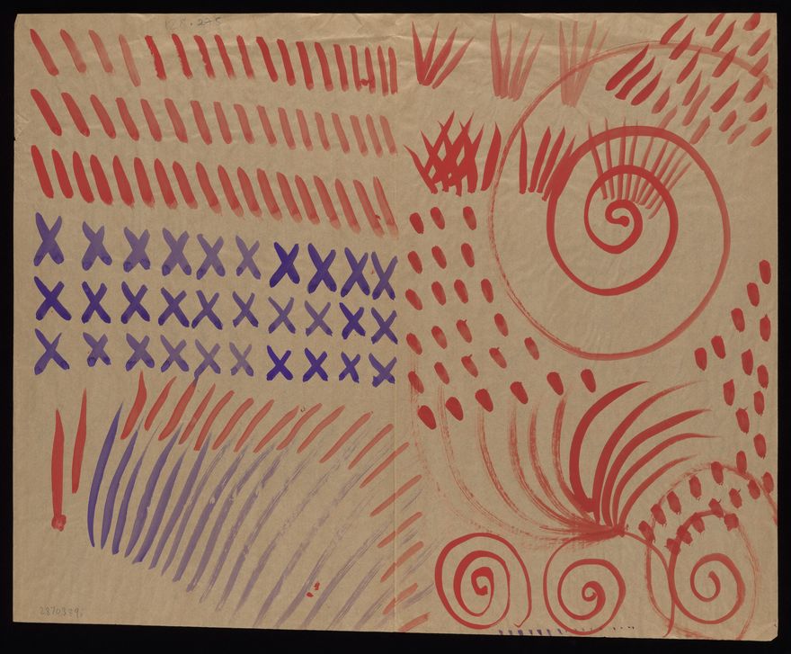 Credit: Red and purple diagonal lines and droplets, purple crosses, red spirals and a face in profile. Source: Wellcome Collection.