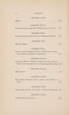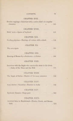![CHAPTER XVII. Basaltic cappings—lInterview with a native chief—A singular character ; ° » 145 CHAPTER XVIII. Birds’ nests—Sports of boyhood . : 15] CHAPTER XIX. Feeding pilgrims—Marriage of a stone with a shrub - 156 CHAPTER XX. The men-tigers . : : : : 2 PO CHAPTER XXI. Burning of Deoree by a freebooter—A Suttee | sg hOS CHAPTER XXII. Interview with the Rajah who marries the stone to the shrub Order of the Moon and the Fish : ~ 172 CHAPTER XXIII. The Rajah of Orcha—Murder of his many ministers ~ £80 CHAPTER XXIV. Corn dealers —Scarcities—Famines in India . . 190 CHAPTER XXV. Tipidemic diseases—Scape-goat .. ; - 209 CHAPTER XXVI. Artificial lakes in Bundeleund—-Hindoo, Greek, and Roman faith =. ; . 3 ; : . 224](https://iiif.wellcomecollection.org/image/b33097318_0001_0019.jp2/full/800%2C/0/default.jpg)