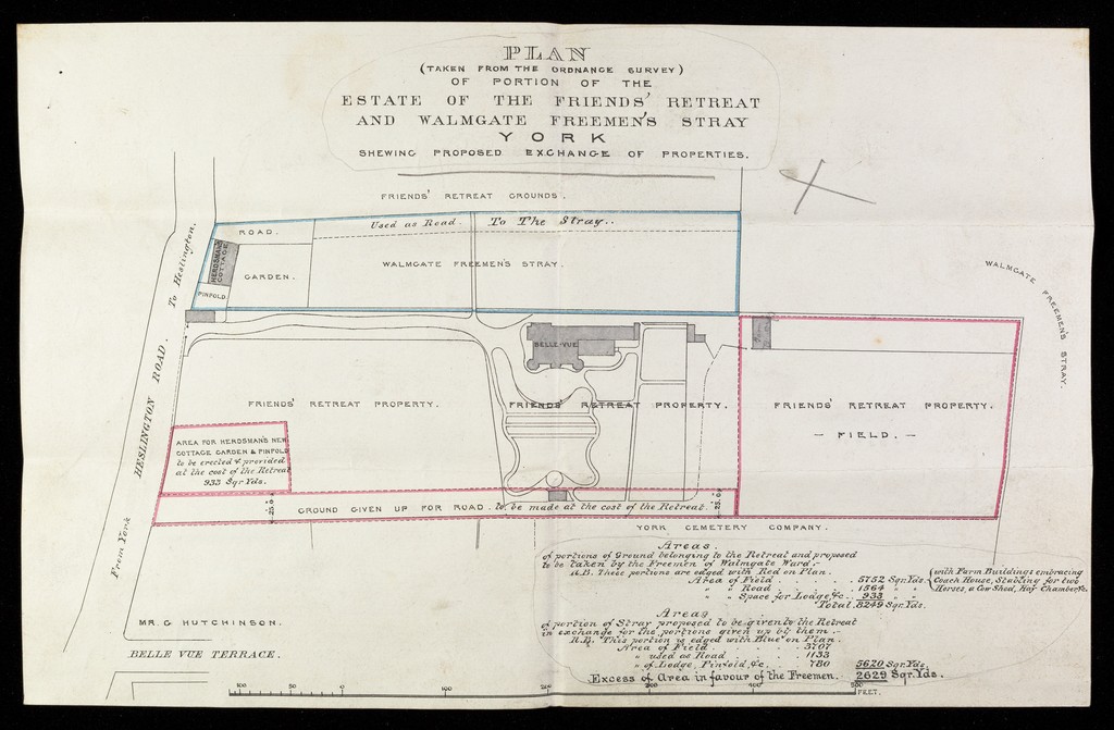 Papers and Correspondence relating to a proposed exchange of some Retreat land (part of the estate of Belle Vue) and a part of Walmgate Stray dividing the Retreat from Belle Vue