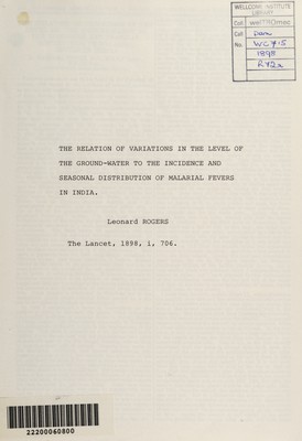 The relation of variations in the level of the ground-water to the incidence and seasonal distribution of malarial fevers in India / by Leonard Rogers.