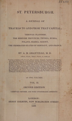St. Petersburgh: a journal of travels to and from that capital. Through Flanders, the Rhenich provinces, Prussia, Russia, Poland, Silesia, Saxony, the federated states of Germany, and France / By A.B. Granville.