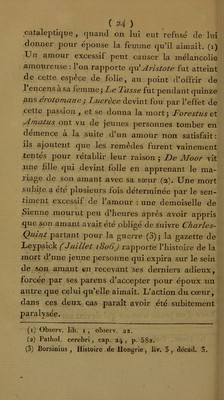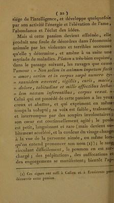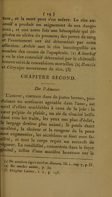 ![ture, et la mort peut s’en suivre. Le rire ex- cessif a produit un saignement de nez dange- reux, et line autre fois une héraoptisie qui dé- ge'uéra en ulcère du poumonj des pertes de sang et l’avortement ont été déterminés par cette affection. Arétée met le rire inextinguible au nombre des causes de l’apoplexie, (i) Kloeckof a vu le rire convulsif déterminé par le cbâtouil- lement suivi de convulsions mortelles. (2) Zeuzis €t Uirysipe moururent de rire. (3) CHAPITRE SECOND. De l’Amouï'. Uamonr, contenu clans de justes bornes, pro- 'dmsant un sentiment agréable dans l’ame, est ! suivi d’effets semblables à ceux de la joie : le icœur palpite de plaisir, un air de vivacité brille idans tous les traits, les yeux ont plus d’éclat, Ile langage devient plus animé; le pouls étant (accéléré, la chaleur et la rougeur de la peau [sont augmentées, les sécrétions se font avec fa- cilité , et tout le corps reçoit un surcroît de •vigueur. La sensibilité, concentrée dans le foyer génital, influe d’une manière heureuse sur le (0 De cimsis els]6„ismorl;or.<lmi„„. ph, , , . (3) De raorbis animi, p. Sa. ^ 7 > P (3) Diogène LaéVce, l. <1 , p. ,tj5.](https://iiif.wellcomecollection.org/image/b28520737_0021.jp2/full/800%2C/0/default.jpg)