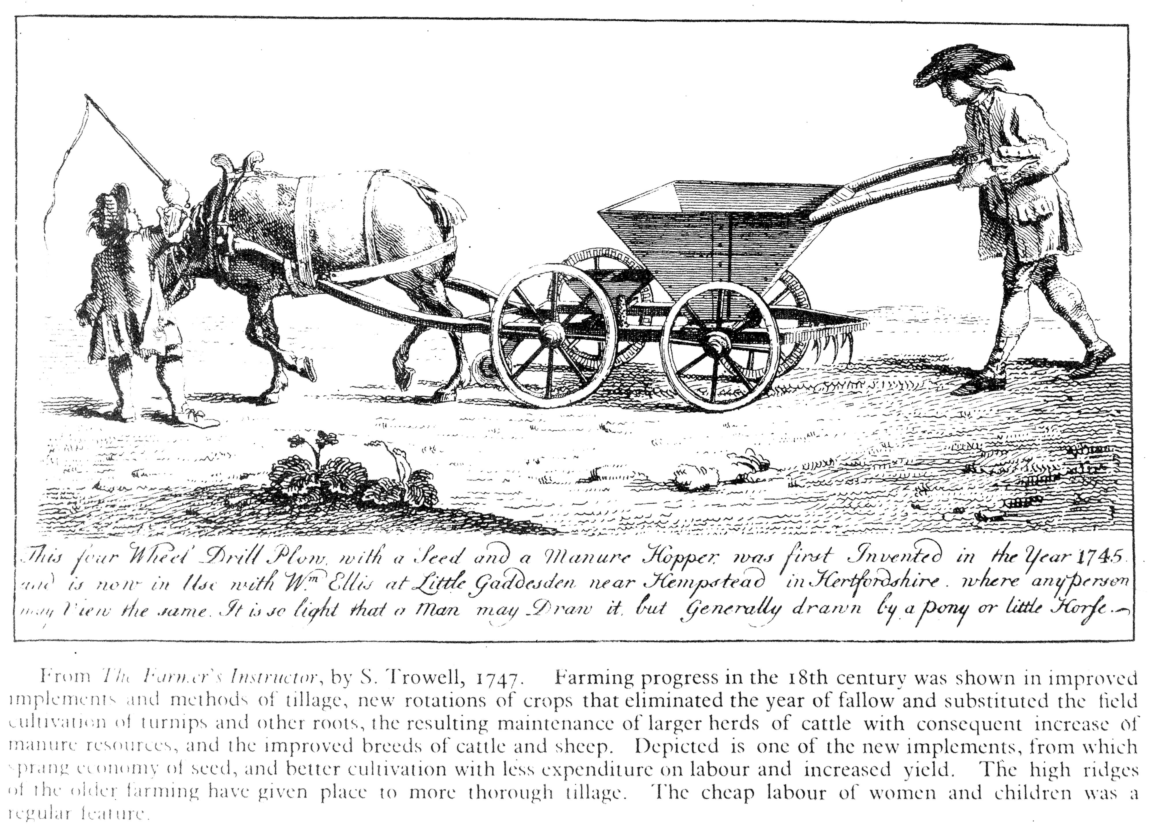 M0003214: Man pushing a four wheel drill plow with a donkey pulling in front / M0003214EB: "View of Barton Bridge". In copyright. Source: Wellcome Collection.