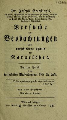 Dr. Joseph Priestley's Versuche und Beobachtungen über verschiedene Theile der Naturlehre ... nebst fortgesetzten Beobachtungen über die Luft / Aus dem Englischen.