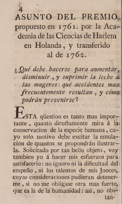 Disertacion ... acerca de lo que debe hacerse para aumentar, disminuir, o suprimir la leche a las mugeres, los accidentes que mas frecuentemente resultan, y modos de prevenirlos; premiada por la Academia de las Ciencias de Holanda el 21. de mayo de 1762 / Por Antonio Gozalbes Collado.