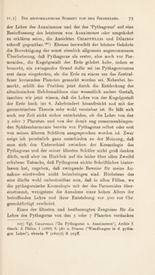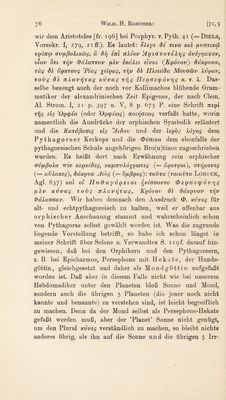 ![wir dem Aristoteles [fr. 196] bei Porphyr, v. Pyth. 41 (=Diels, Yorsokr. I, 279, 21 ff.). Es lautet: sXeye de uva xai avöuxtp tQÖJtG) 6v[ißoXncä)s, oc drj eitl TtXeov Aq 16roteXyjg äveyqajpev, olov du tr}v frocXarrav ytev hxdXei eivut (Kqovov} daxqvov, rag de äqxrovg '’Peag %elqag, rrjv de IJXeidda Movö&v Xvqav, rovg de 7t Xavrjr ag xvvag rijg Ueqöetpövrjg x. r. X. Das¬ selbe bezeugt auch der noch vor Kallimachos blühende Gram¬ matiker der alexandrinischen Zeit Epigenes, der nach Clem. Al. Strom. I, 21 p. 397 u. V, 8 p. 675 P. eine Schrift Tteql rrjg eig 'Oqtpea (oder ■Ögcpecog) itoitföewg verfaßt hatte , worin namentlich die Ausdrücke der orphischen Symbolik erläutert und die Karaßaötg eig Atdov und der leqog Xöyog dem Pythagoreer Kerkops und die ®v6ixa dem ebenfalls der pythagoreischen Schule angehörigen Bro(n)tinos zugeschrieben wurden. Es heißt dort nach Erwähnung rein orphischer 6v[ißoXcc wie xeqxtdeg, xaytTtvXo^Qcoreg (== dqorqot)^ örrßiovsg (= avXaxeg\ daxqva Aiog (= d^ßqog): ravra (roiavta Lobeck, Agl. 837) xal ol JTuff ccy6q e 101 tjvCoöovro Oeqöetpovrig (.1 ev xvvag rovg 7t Xavrjr ag, Kqovov de daxqvov rijv fraXaööav. Wir haben demnach den Ausdruck xvveg für alt- und echtpythagoreisch zu halten, weil er offenbar aus orphischer Anschauung stammt und wahrscheinlich schon von Pythagoras selbst gewählt worden ist. Was die zugrunde liegende Vorstellung betrifft, so habe ich schon längst in meiner Schrift über Selene u. Verwandtes S. 119h darauf hin¬ gewiesen, daß bei den Orphikern und den Pythagoreern, z. B. bei Epicharmos, Persephone mit Hekate, der Hunde¬ göttin, gleichgesetzt und daher als Mondgöttin aufgefaßt worden ist. Daß aber in diesem Falle nicht wie bei unserem Hebdomadiker unter den Planeten bloß Sonne und Mond, sondern auch die übrigen 5 Planeten (die jener noch nicht kannte und benannte) zu verstehen sind, ist leicht begreiflich zu machen. Deun da der Mond selbst als Persephone-Hekate gefaßt werden muß, aber der 'Planet’ Sonne nicht genügt, um den Plural xvveg verständlich zu machen, so bleibt nichts anderes übrig, als ihn auf die Sonne und die übrigen 5 Irr-](https://iiif.wellcomecollection.org/image/b29979109_0084.jp2/full/800%2C/0/default.jpg)