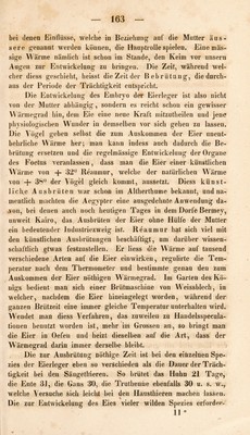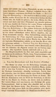 ![obwohl man strenge genommen in Beziehung auf ihre Funktion die letzten Verzweigungen der Umbilikalgefässe als eine Placenta ansehen konnte. Es besteht mithin im Allgemeinen eine voll- kommene Analogie zwischen dem Eie der eierlegenden und leben- diggebärenden Thiere, und überhaupt gehen alle Unterschiede in der Bildung der Thiereier immer nur aus der Art hervor, auf welche die Ernährung und die Respiration des Foetus ver- mittelt wird. Zweiter A r t i k * e 1. Vom Eie der Amphibien. In Beziehung auf die Bildung des Eies theilt Flour en s die Am- phibien in zwei grosse Abtheilungen. Von diesen enthält dieeinedie Chelonier, Saurier und Ophidier, deren Eier denen der \ögel und Säugethiere gleichen; und die andere die Batra- chier, deren Eier mit denen der Fische Übereinkommen. Alle sogenannten kaltblütigen Thiere überlassen ihre Eier der Wärme desjenigen Mediums, in welches sie gelegt worden sind. Chelonier. — Ueber das Ei der Schildkröte, dessen Ent- wickelungsgeschichte wenig gekannt war, hat Tiedemann in- teressante Untersuchungen angestellt. Die Ausbrütung des Vo- geleies verbreitet auch Licht über die Entwickelung der jetzt zu betrachtenden Eier. Das Ei der Seeschildkröte hat eine kugel- förmige Gestalt und besteht aus folgenden Bestandtheilen: ]) efner Kalkschaale; 2) einer -Schaalenhaut, die man in zwei Platten trennen kann und die mit kleinen, schwarzen und grauen Punk- ten bedeckt ist, welche man selbst durch die Schaale hindurch wahrnimmt; 3) dem Eiweiss; 4) einem runden, im Mittelpunkte des Eiweiss gelegenen Dotter; 5) der Narbe; 6) der Allantois und 7) dem Amnion. Der Dotter lässt seine Flüssigkeit mit- telst eines Stiels in den Darm übergehen, und tritt in den Bauch](https://iiif.wellcomecollection.org/image/b29309608_0174.jp2/full/800%2C/0/default.jpg)