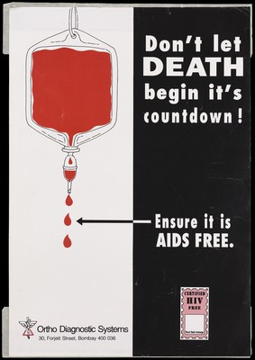 Credit: A dripping blood transfusion bag with the warning 'ensure it is AIDS free' and a pink ticket bearing the lettering 'Certified HIV free'; an advertisement issued by Ortho Diagnostic Systems. Colour lithograph, ca. 1998. Source: Wellcome Collection.